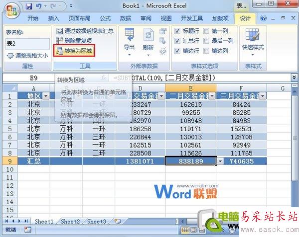 ⑥求和匯總結束之后,點擊工具功能組里面的轉換為區域選項。