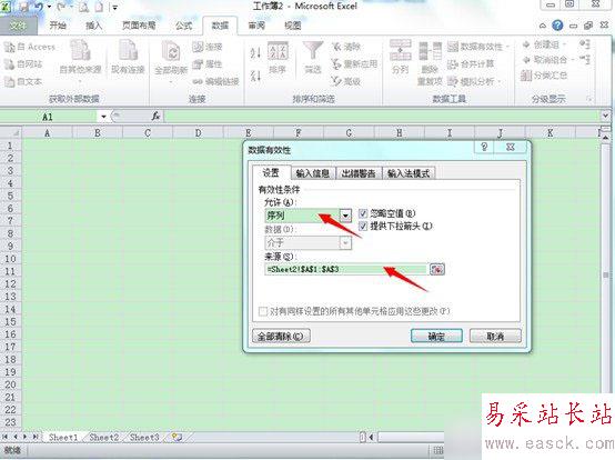 第二步:在“允許”下框中選擇“序列”在來源中選擇制作下拉菜單的內(nèi)容,比如下面圖中所選的內(nèi)容就是在“Sheet2表中的A1至A3”,最后點(diǎn)擊“確定”完成下拉菜單制作。