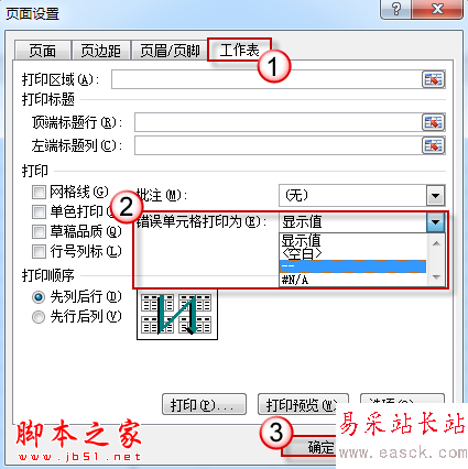 2、切換到“工作表 ”選項卡,從“錯誤單元格打印為 ”右側的下拉框中根據需要選擇“空白 ”或“-- ”。
