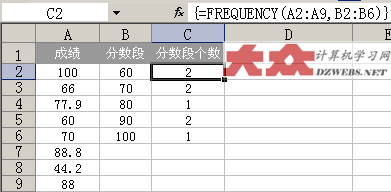 如上圖一樣,首先選中C2:C6這個范圍的單元格,然后在FX函數輸入欄中,輸入公式: =FREQUENCY(A2:A9,B2:B6 然后,一起按下Ctrl+Shift+Enter這三個鍵,這樣,上面的公式就自動變成 {=FREQUENCY(A2:A9,B2:B6} 多了一對大括號,注意哦,這對大括號不是通過鍵盤直接輸入的,而是通過剛才的Ctrl+Shift+Enter這三個鍵按出來的。