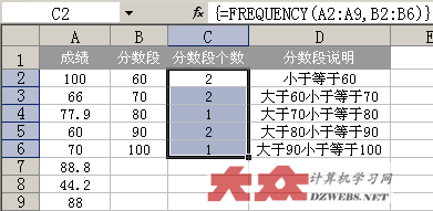A列為原始數據,B列為各分數段的設定,C列為要統計出的各分數段的結果。