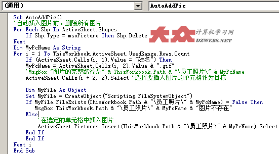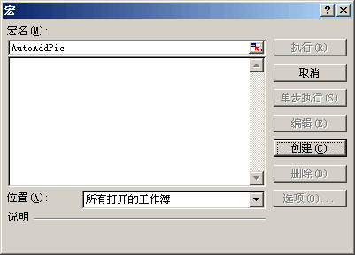 上圖中,宏名那里,輸入 AutoAddPic ,然后,點擊“創建”按鈕,彈出代碼輸入窗口,如下圖。