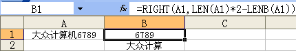 通過(guò)公式:=RIGHT(A1,LEN(A1)*2-LENB(A1))