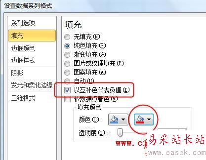 2、雙擊圖表中的數據系列,彈出“設置數據系列格式”對話框,選擇“填充”。在右側區域中選擇“純色填充”,并勾選“以互補色代表負值”。這時下部的“填充顏色”區域中會增加一個顏色選擇按鈕,單擊右側的顏色選擇按鈕選擇一種顏色,如紅色,然后關閉對話框。