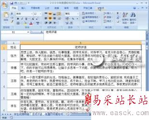 此外由于通知書中還需要添加老師的評語,因此新建一個工作表,將其命名為“老師評語”,然后在此表的A列中將學生成績明細中的學生名單復制過來,然后在B列中輸入老師對每個學生的評語(圖2)。