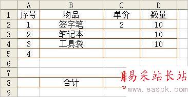在這四列中任意一個(gè)單元格中輸入數(shù)據(jù)(包括空格),此行(A→D列)各單元格將會(huì)自動(dòng)添加框線。如圖3。