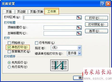 這時會彈出頁面設置的窗口,選擇【工作表】選項卡,在【打印】欄內選擇“ (單色打印)”選項,然后點【打印】便可。