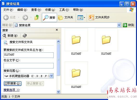 通過(guò)使用Windows搜索功能,查找電腦中名為XLSTART的文件夾,如圖所示:
