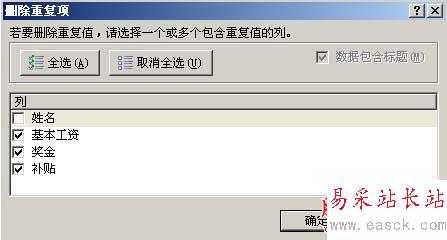 在彈出的“刪除重復(fù)項(xiàng)”對(duì)話框選擇要檢查的字段,最終將只對(duì)選中的字段進(jìn)行比較。這里選擇后三個(gè)字段。