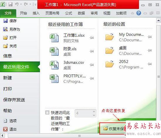 方法二、在“文件”選項卡中單擊“最近所用文件”選項卡,在其界面中單擊“最近的位置”列表框下方的“恢復未保存的工作薄”按鈕,如圖所示: