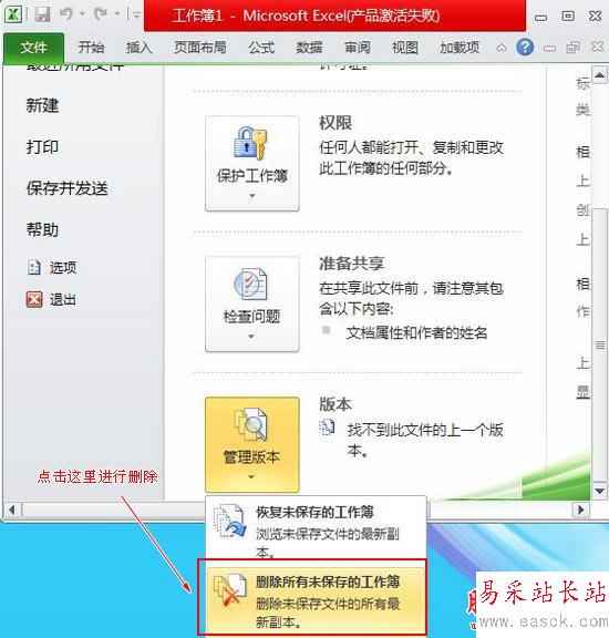如果未保存的工作簿都不是用戶所需要的文件,為了減輕電腦的存儲負擔,可將這些文件刪除,其操作為在“文件”選項卡中單擊“信息”選項卡,在其界面中單擊“管理版本”按鈕,在彈出的下拉菜單中選擇“刪除所有未保存的工作簿”命令,在打開的提示對活框中單擊“是”按鈕,即將所有未保存的工作簿刪除,如圖所示: