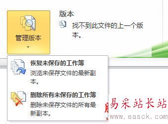 方法一、在“文件”選項卡中單擊“信息”選項卡,在其界面左側單擊“管理版本”按鈕,如圖所示: