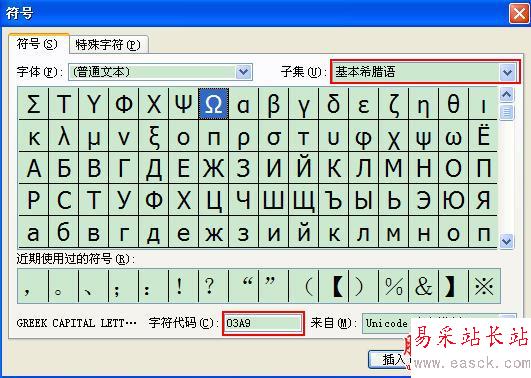 在彈出的符號選項卡上,我們又有2種方法來打出歐姆符號,第一種方法就是直接在在【子集】的選項,選項【基本希娜語】,然后在下面符號中,就可以找到歐姆符號Ω了。直接在excel打入歐姆符號的第二種方法就是,直接在字符代碼中輸入03a9幾個數字,就自動幫你找到歐姆符號,再點擊【插入】即可,如下圖所示: