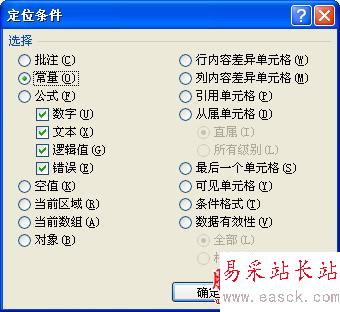 在“查找和選擇”下拉菜單中選擇“定位條件”命令,打開“定位條件”對話框,在其中選中“常量”單選按鈕,在其中顯示可用的復選框中可設置更多的定位選項,如是否選擇文本、邏輯值或錯誤單元格等,實現excel如何快速定位單元格,如圖所示。