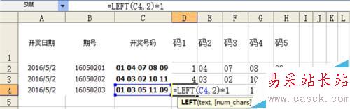 1、例如,我們要分析彩票數據,用left函數分揀出第一個號碼。