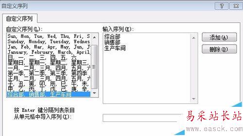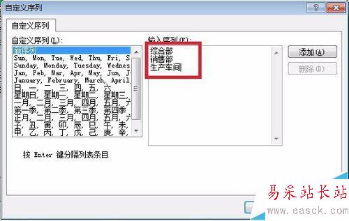 3、在打開的自定義序列對話框中,選擇新序列,并在右側(cè)文本區(qū)輸入指定的排序序列,各字段之間以Enter回車鍵分割,點(diǎn)擊確定按鈕。