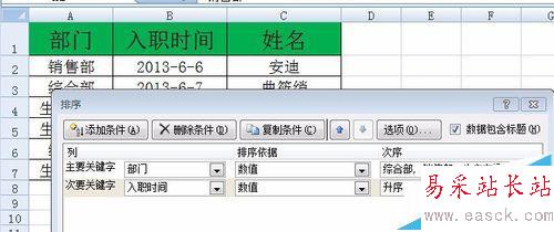 5、設(shè)置次關(guān)鍵字的字段為“入職時(shí)間”,次序下拉列表區(qū)選擇“升序”,點(diǎn)擊確定按鈕,排序工作就完成了。