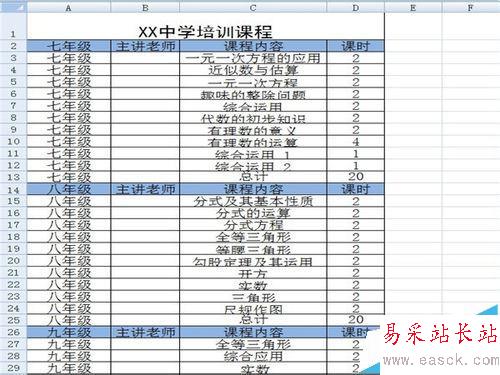 1、打開一個表格,我們看到里面有七、八、九三個年級的培訓課程。如果我們每次只想看到一個年級的培訓課程,怎么設置呢?