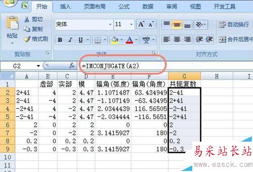 8、輸入公式=IMCONJUGATE(A2),求出共軛復(fù)數(shù)。