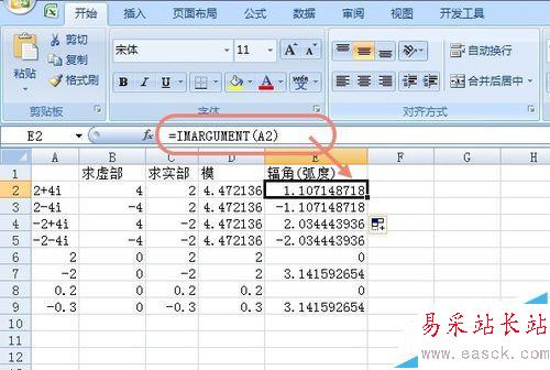 6、輸入公式=IMARGUMENT(A2),來求出復(fù)數(shù)的輻角,注意是弧度值。