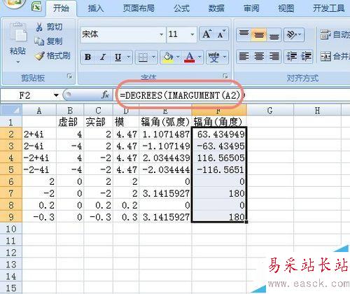 7、如果需要得到角度值,可以使用公式=DEGREES(IMARGUMENT(A2))。這樣可以將弧度轉(zhuǎn)換成角度。
