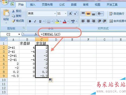 4、輸入公式=IMREAL(A2),求出復(fù)數(shù)的實部,即實數(shù)部分。
