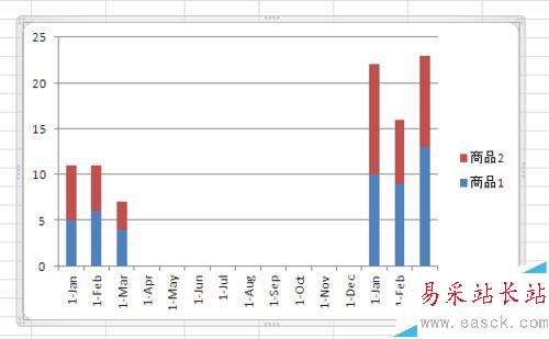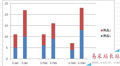 如圖,商品1和商品2進行兩年度的銷售量同比,用下圖中的堆積圖來表現就要清楚很多。