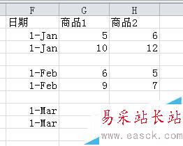 1、對數據表重新布局,先把數據表復制到F1,然后每組數據之間加入一個空行,把標題中的日期刪除(這樣Excel會默認日期列為分類標志)