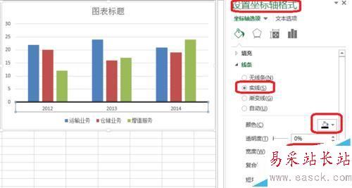 1、點(diǎn)擊設(shè)置坐標(biāo)軸格式,X軸線的類型(實(shí)線)——顏色——寬度設(shè)置。如圖所示。