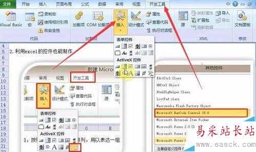 4、在Excel的工具欄里就可以看到多了一個“開發工具”,這時打開“開發工具”,選擇“插入”,如圖: