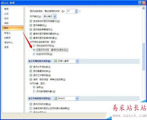 4、選擇高級--顯示--對于帶批注的單元格,顯示--勾選第二個,確定