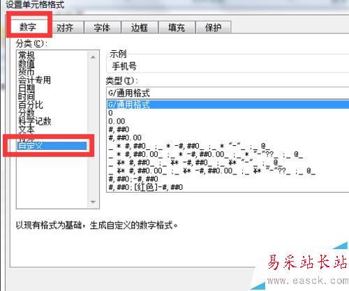 3、我們在“數字”界面單擊下選中【自定義】,然后我們在“類型”里面輸入000-0000-0000的格式內容,就是我們手機號碼的11位數字顯示格式。輸入完成我們就點擊【確定】就可以了,我們看看下面圖示的效果吧~