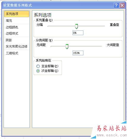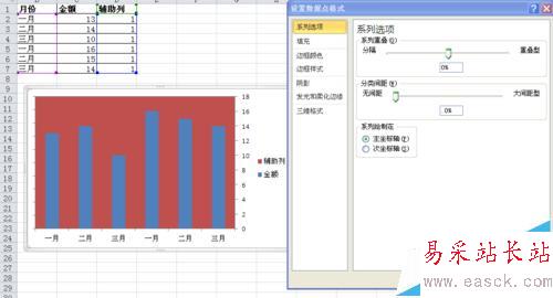 5、設置“輔助列”系列格式,“分類間距”為0%。