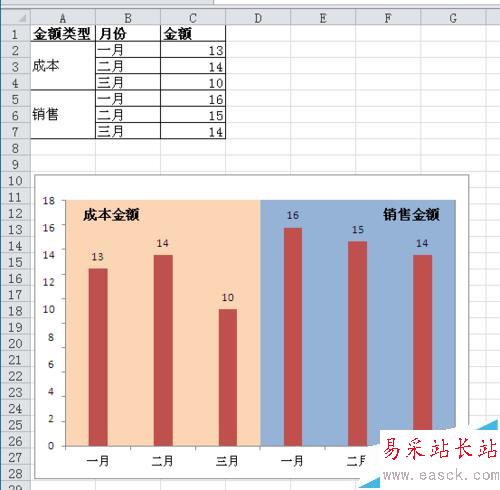 如圖,數據表中有成本和銷售兩組數據,我們想做出如圖中的效果,相當于兩個小圖表在一張圖表中呈現,雖然我們可以把兩組數據做為兩個系列來呈現,但~有些變化總是好的嘛。