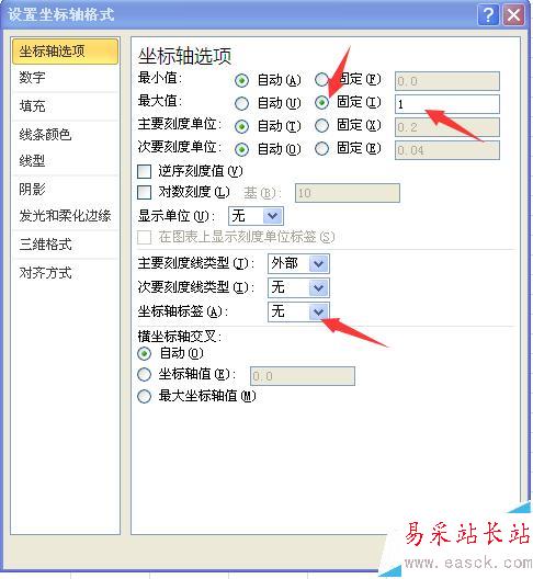 4、雙擊主坐標軸,調出“設置坐標軸格式”對話框,“最大值”選“固定”,值為1.“坐標軸標簽”選“無”,確定。
