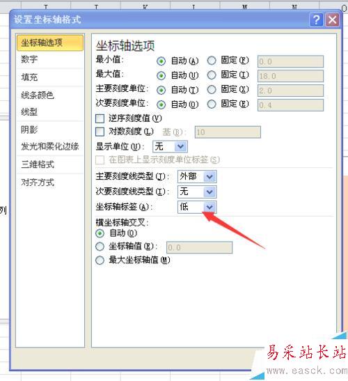 6、雙擊次坐標軸,“坐標軸標簽”設置為“低”,效果如圖,大家已經看出來了,我們是用柱形圖來代替背景