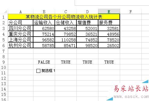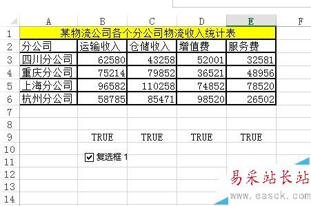 3、復(fù)選框控件效果,如圖所示,勾選——單元格顯示TRUE,不勾選FALSE。利用這個(gè)特性構(gòu)建動(dòng)態(tài)數(shù)據(jù)源。