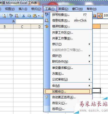 1、首先新建一個(gè)“新建 Microsoft Excel 工作表”,打開(kāi)后點(diǎn)擊“工具”-“加載宏”