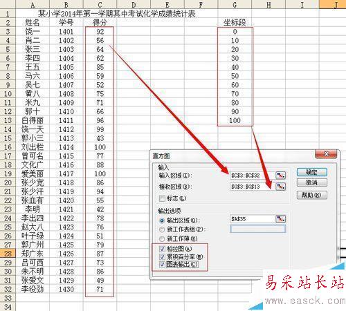4、選擇“工具”-“數(shù)據(jù)分析”-“直方圖”,出現(xiàn)對(duì)話框,如圖所示設(shè)置好