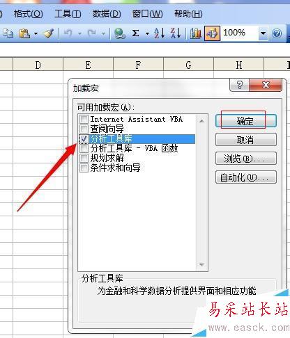 2、彈出對(duì)話框在“分析工具庫(kù)”打勾后點(diǎn)確定,(假如你的Excel沒(méi)有這個(gè)選項(xiàng),說(shuō)明你用的是精簡(jiǎn)過(guò)度版,建議重新下載)