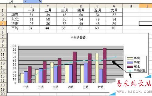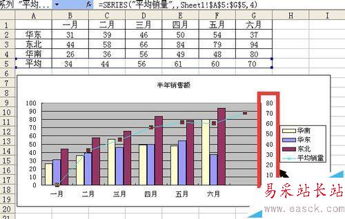 5、此時平均銷量系列已經(jīng)有柱狀圖變成折線圖了 如下圖所示