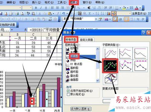 4、選中剛剛生成的平均銷量系列 點擊菜單欄圖表 圖表類型 標(biāo)準(zhǔn)類型 折線圖 選擇數(shù)據(jù)點折線圖然后點擊確定