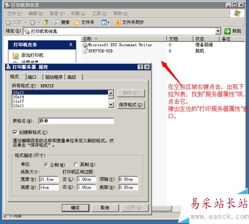 打印機安裝好后,依次點擊“開始”菜單—〉“控制面板”—〉“打印機和傳真”(或者“開始”/“打印機的傳真”)。打開打印機窗口后,在窗口上的空白處右擊鼠標右鍵。找到下拉列表中的“服務器屬性”選項,點擊一下,應會彈出“打印服務器屬性”窗口。