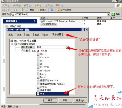 回到或重新打開“打印機與傳真”窗口,右鍵點擊你打印單據的打印機,屬性,彈出“XXXX打印機屬性”窗口。點擊“設備設置”,在“按送紙器格式指派”的“滾筒進紙器”及“手動進紙”兩個選項的后面,點擊小黑三角,出現下拉列表中找到“聯單”(一般自定義的紙張在最下面)。確定退出。