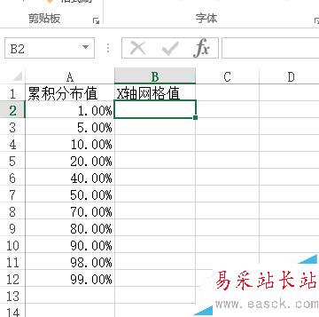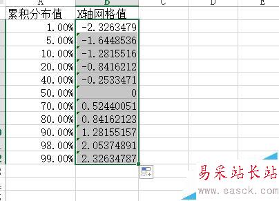 打開2013版excel,按自己的需要輸入一系列累積分布值。在”X軸網格值“那一列的第二個單元格中插入公式"NORM.S.INV"。在彈出的窗口的"probability“處選一開始輸入的系列累積分布值,選確定,空格,填充柄下拉,即得到正態刻度數值。