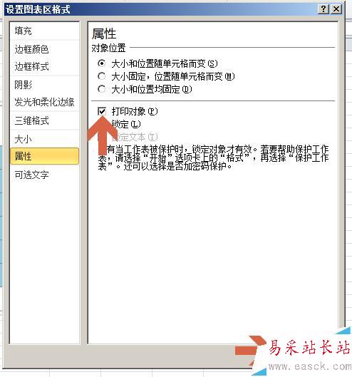 5、在“屬性”框中有一項“打印對象”。如果這一項沒被勾選就不會打印這個圖表。