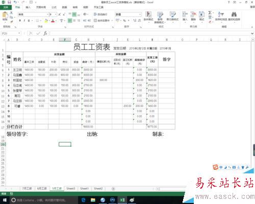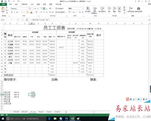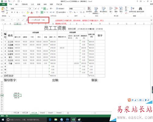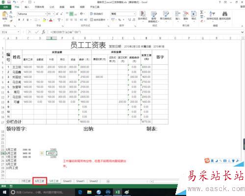 2、這里是一張工資表,我們如果需要查詢比較某人這三個月的工資總額情況,正常操作是點開每一張工資工作薄,然后將其中數據記錄下來再進行比較。這樣的方式就非常的繁瑣。當然我們也可以使用公式來做工作薄引用。