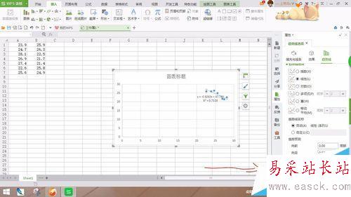 6、然后選擇添加趨勢線項,就會生成一條回歸曲線,這是繼續右鍵單擊表格,看到設置表格后,點進去,選擇線性、顯示方程、r的平方,就完成了