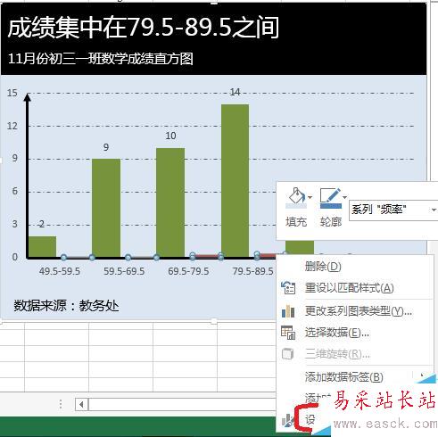 3、右擊(頻率的柱子)——設置數據系列格式——次坐標軸。