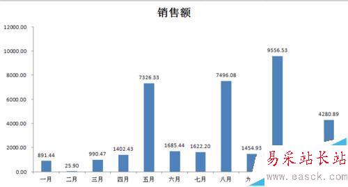 如下圖,是一個簡單的月銷售額報表,我們以柱形圖為例,先以它做為數據源生成一個柱形圖表。